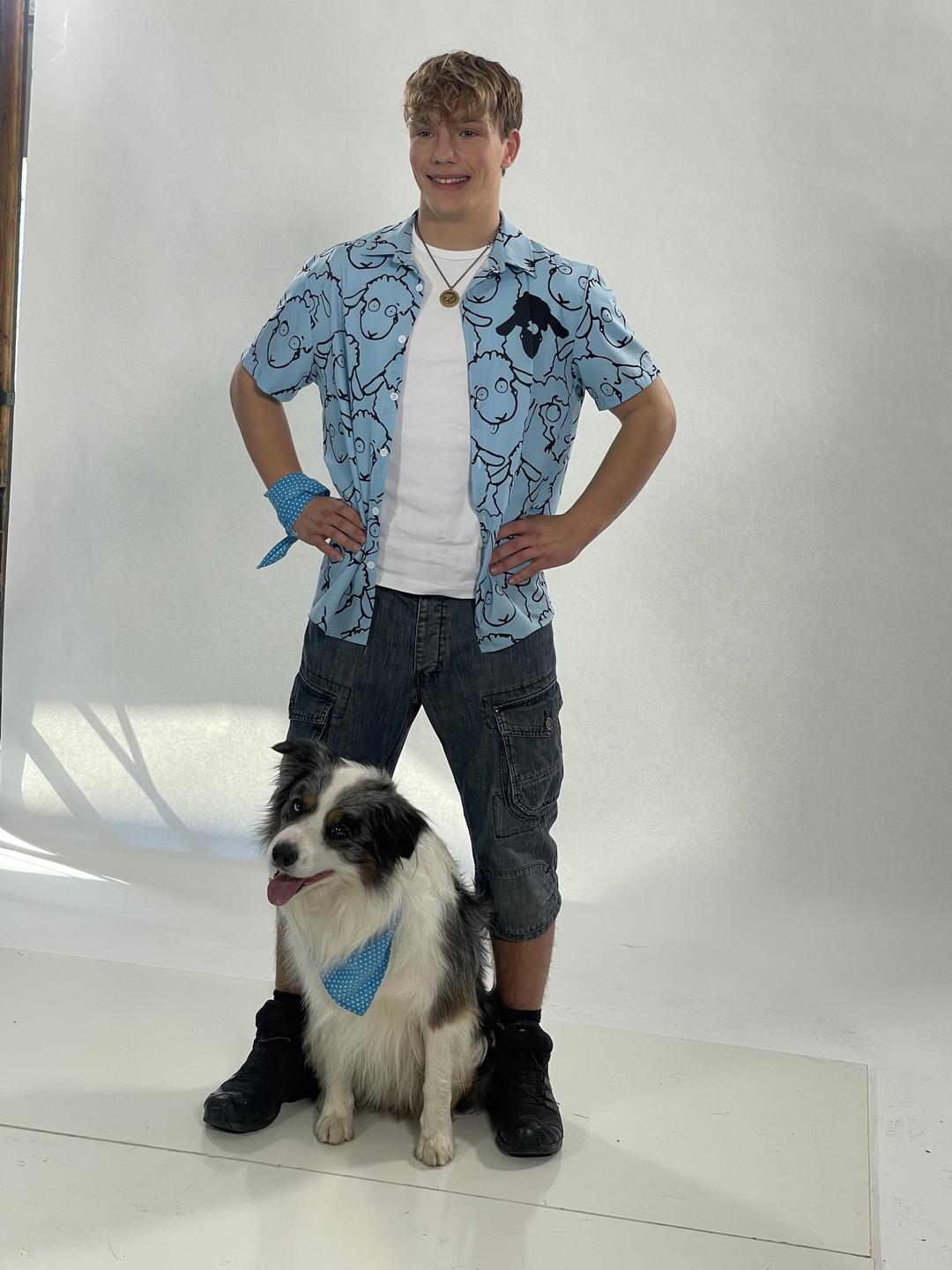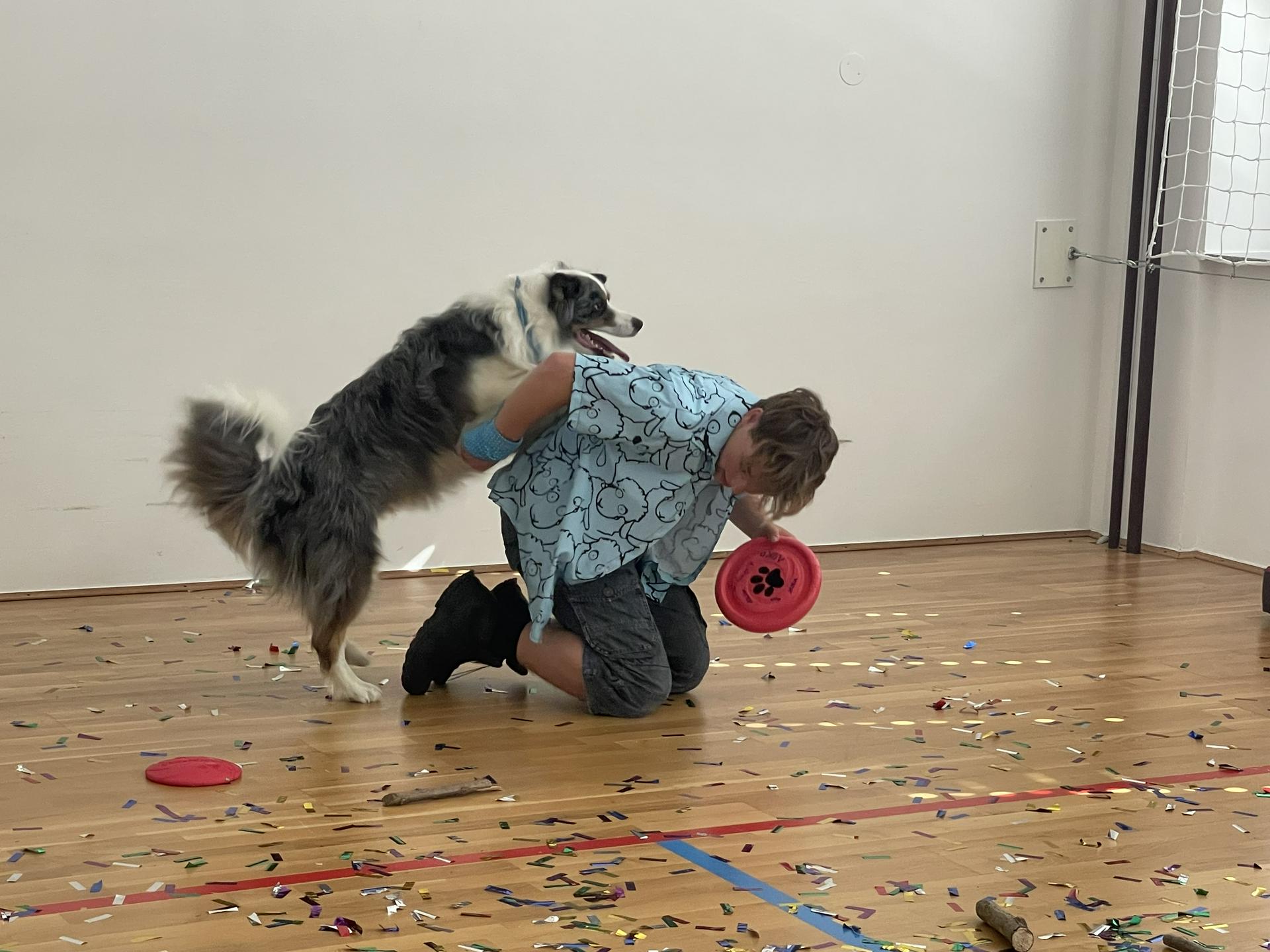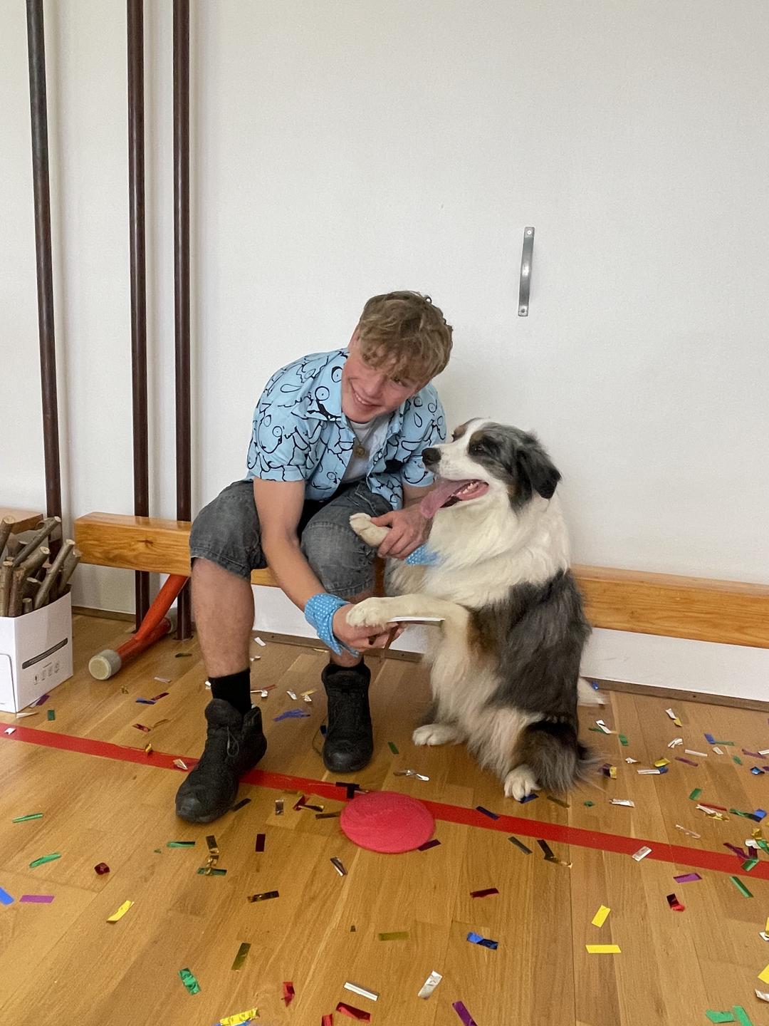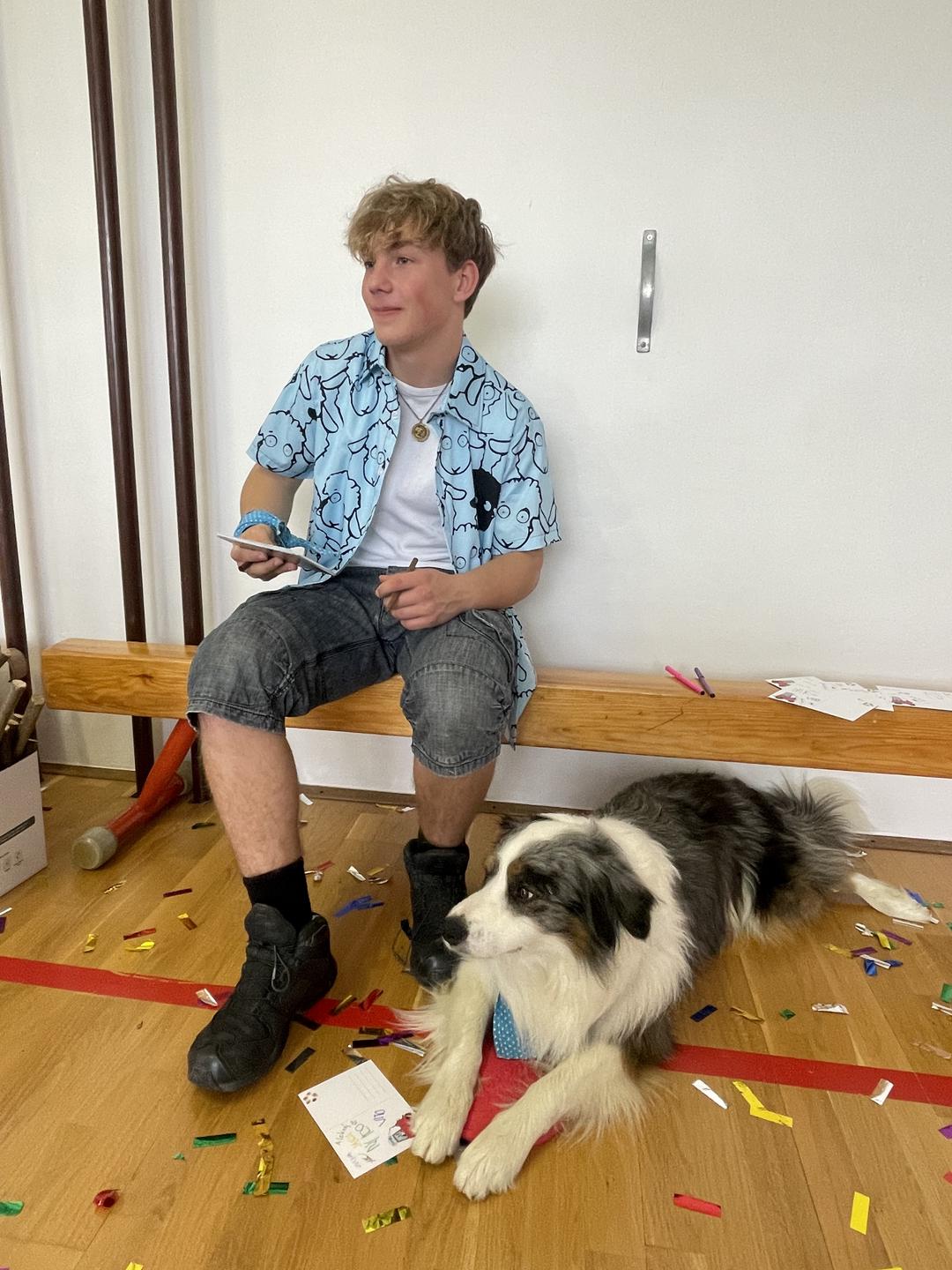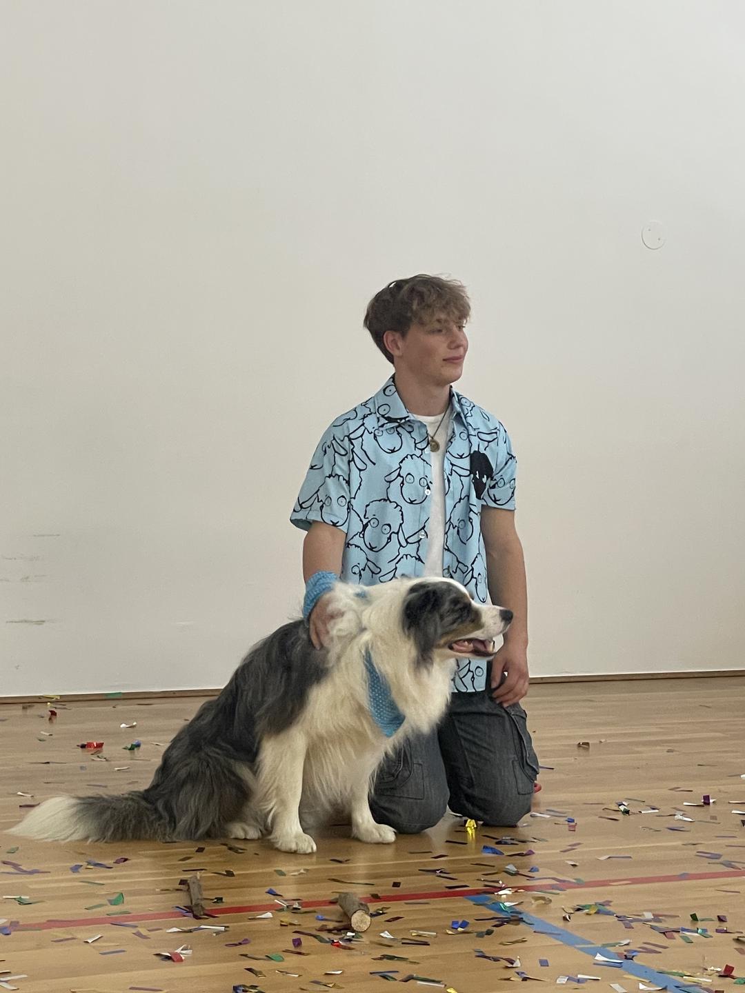 Pevec in voditelj Aleksej s Pojem in mamo. Oba si prizadevata, da bi Po postal terapevtski pes, zato ga pridno trenirata različnih veščin. Foto: Tanja Mojzer