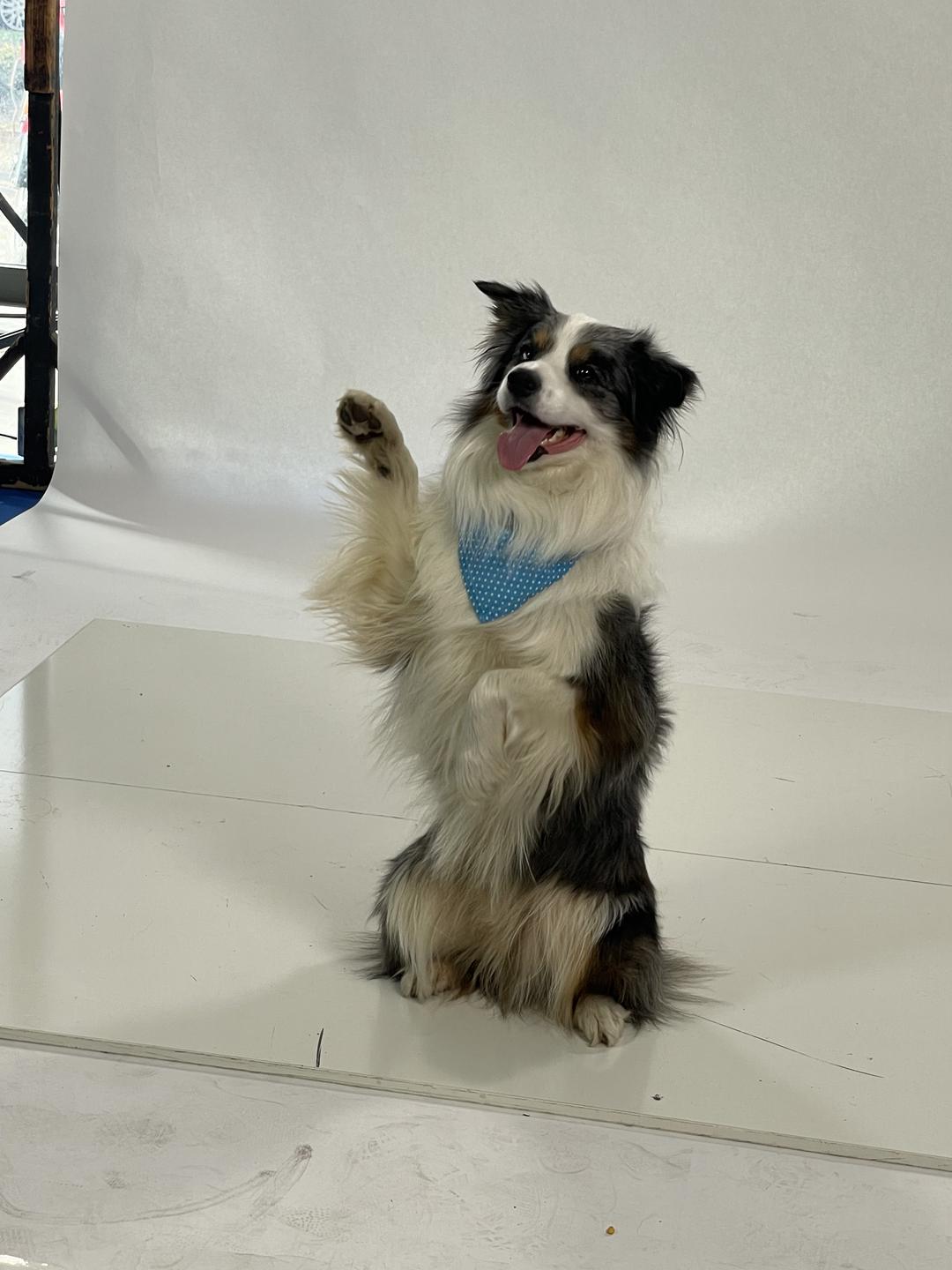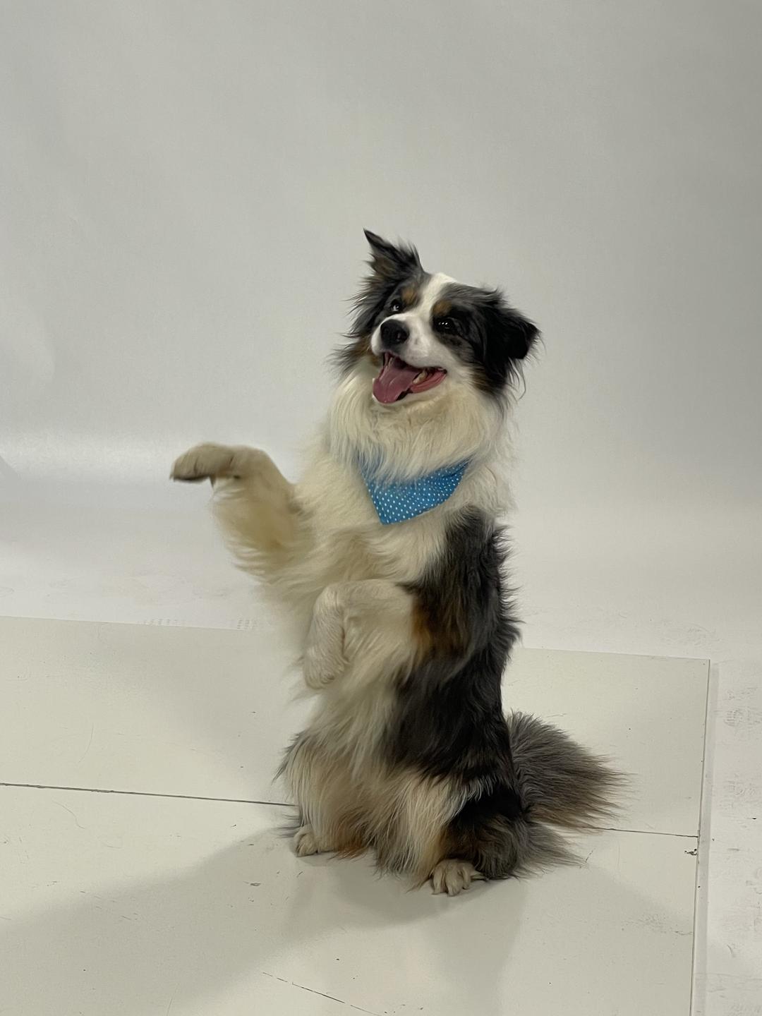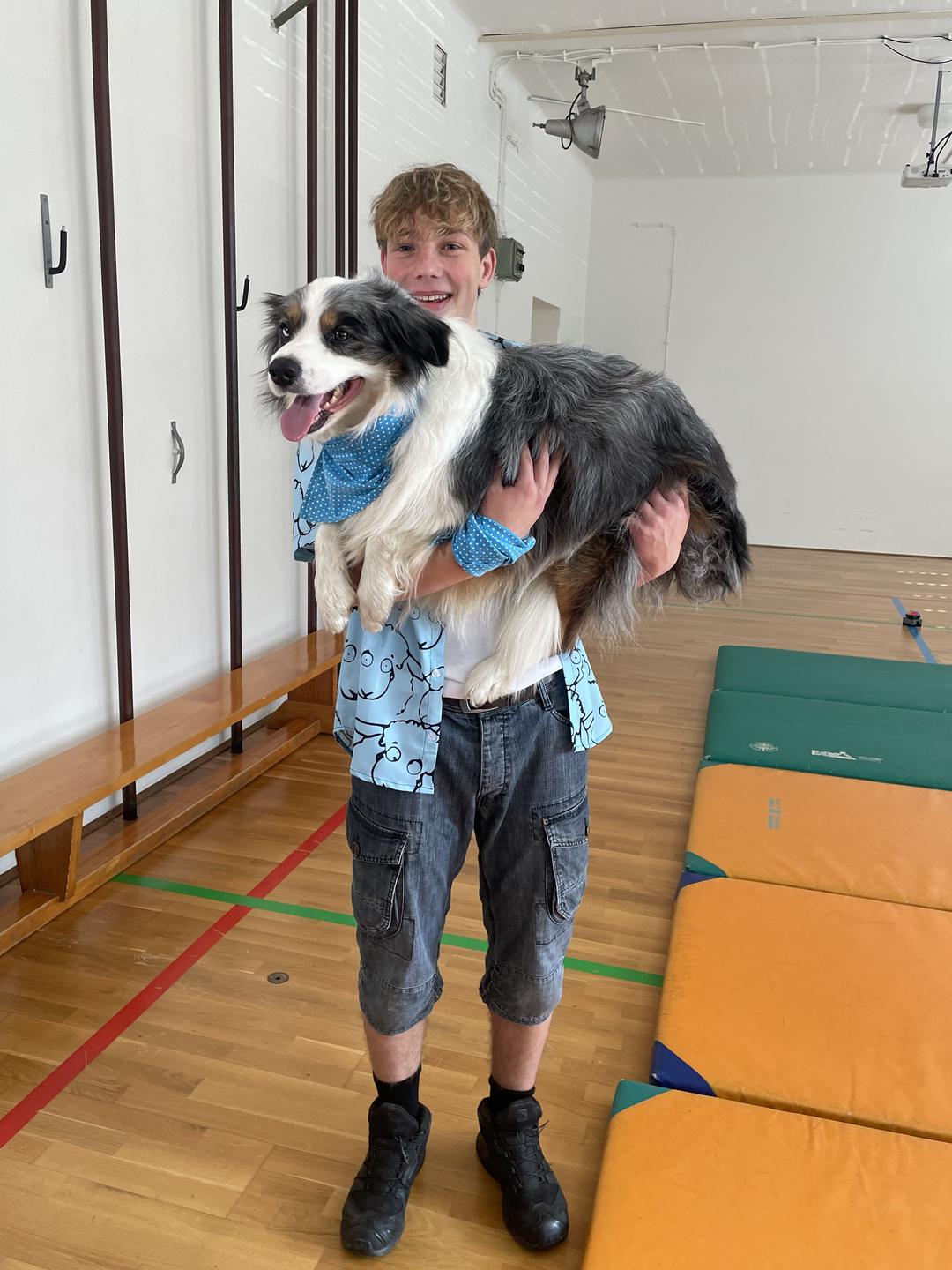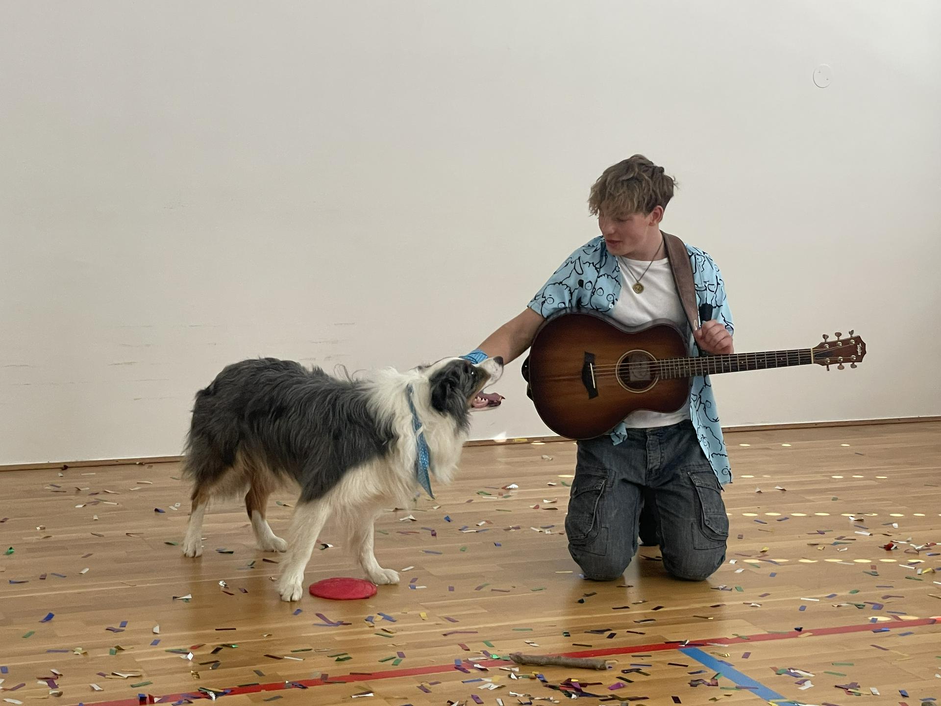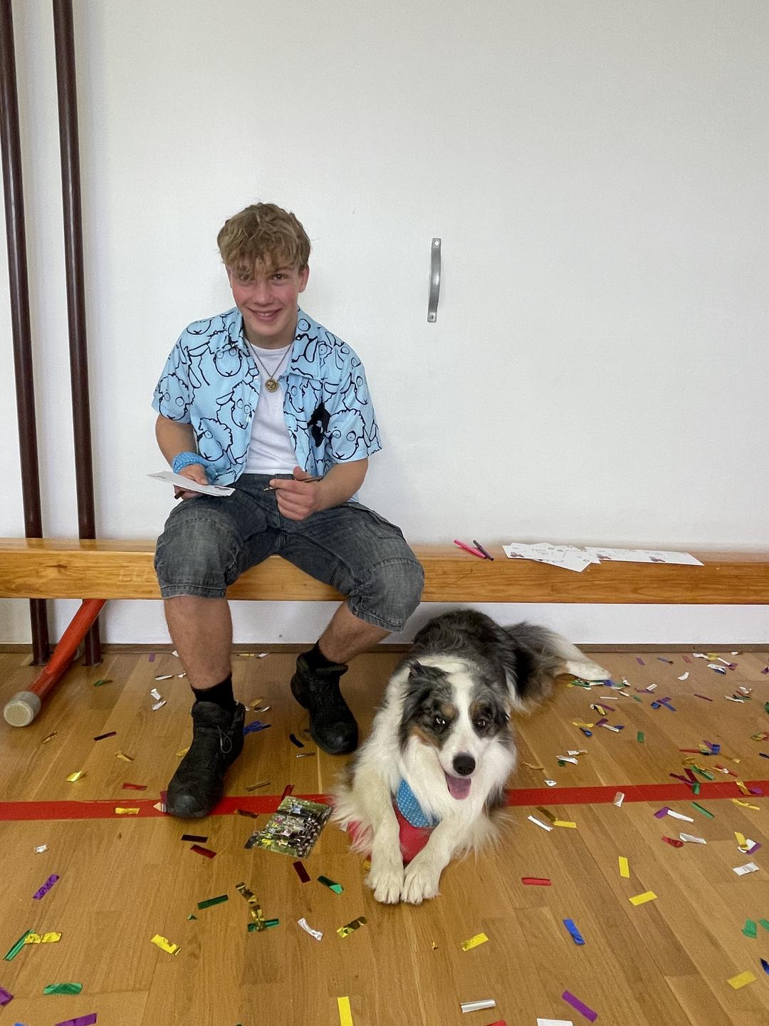 Pevec in voditelj Aleksej s Pojem in mamo. Oba si prizadevata, da bi Po postal terapevtski pes, zato ga pridno trenirata različnih veščin. Foto: Tanja Mojzer