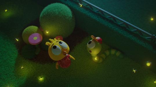 Črv in Živa taborita na vrtu. Ponoči, ko Živo tišči lulat, se prijatelja bojita zapustiti šotor, ker so se baterije v svetilki izpraznile. Nočni zvoki ju strašijo in Živa ne more lulati, dokler ne pridejo kresničke. Noč ni več strašna in prijatelja občudujeta ozvezdja. Zjutraj se teme ne bojita več.